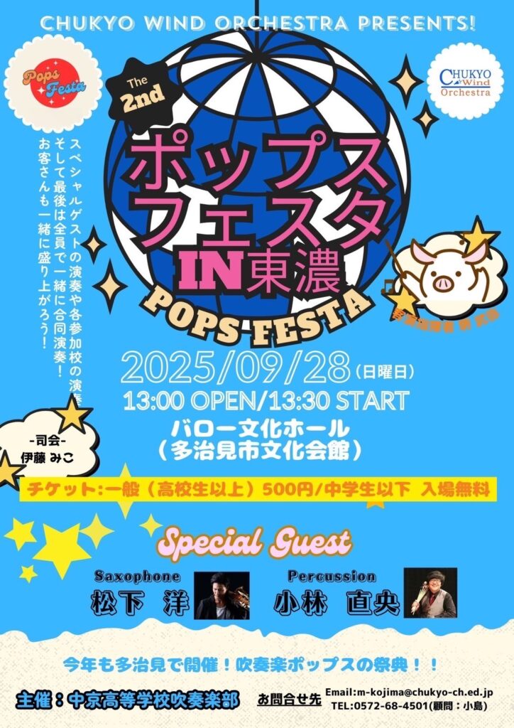 9/28(日)中京高校吹奏楽部さま主催の「ポップスフェスタin東濃」に出演いたします!東濃ウィンドは14:20からの出演予定です。